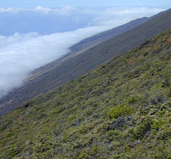 Home Introduction Ecoregion Conservation Targets Viability Goals Portfolio TNC Action Sites Threats Strategies Acknowledgements ▫ Tables Maps & Figures CPT Database Appendices Glossary Sources . Coprosma montana (pilo) grows in dry montane and subalpine habitats.  Small, tough drought-resistant leaf forms dominate in Hawaiian subalpine systems | | Subalpine System Natural communities between 2000 m (6000 ft) and 3000 m(9000 ft) elevation comprise the Subalpine System in the Hawaiian HighIslands Ecoregion. The Subalpine System is restricted to two islands:Hawai‘i and Maui, and occupies the near-summit regions ofthe highest mountains on those islands (Haleakalā on Maui; Mauna Keaand Mauna Loa on Hawai‘i) immediate below the alpine system, and immediately above montane dry and montane mesic systems. There are several natural communities described within thesubalpine system; including forest, shrublands, and grasslands. Rawbiological diversity is not high in this system, but specializedplants and invertebrates occur there, as well as bird species adaptedto foraging and nesting in subalpine habitats. These include oneof the honeycreepers, the Palila (Loxioides baileui), Māmane-Naio (Sophora chrysophylla - Myoporum sandwicense) Subalpine Dry Forest, and Deschampsia nubigena Subalpine Dry Grassland. The Palila is a Hawaiian honeycreeper that requires intact māmane-naio subalpine dyr forest. Photo: Jack Jeffrey. Deschampsia grassland in the central district of Haleakalā, Maui. Photo: Forest and Kim Starr. Subalpine natural communities are listed among nested targets via the appendices. | | TheSubalpine System in Hawai‘i lies largely above the clouds andis dominated by mesic to dry shrublands, grasslands, and a few forest types. Subalpine slopes of Haleakalā, Maui. Photo: Forest & Kim Starr. TheSubalpine System on Hawai‘i Island (red area)occurs in four conservation areas (Mauna Kea, Ka‘ū-Kapāpala, Kona, and Pōhakuloa-Pu‘u Wa‘awa‘a) from 6000-9000 feet elevation.  TheSubalpine System on Maui (red area) occurs only in theEast Maui conservation area, from 6000-9000 feet elevation. |